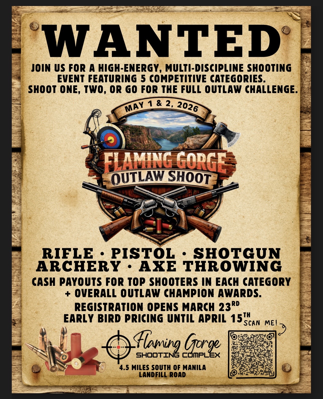 Flaming Gorge Outlaw Shoot Stay in our lodging any nights April 30 – May 3 & get 20% Off your lodging, use promo code: OLSHOOT + Add to Google Calendar + iCal / Outlook export 00 days 00 hours 00 minutes 00 seconds Date May 01 - 02 2026 Time All Day Share this event